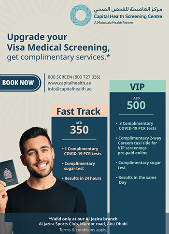 Guests at CHSC’s Al Jazira branch, who choose to upgrade their Standard visa screening package to Fast Track or VIP screening can now enjoy complimentary benefits like up to 3 COVID-19 PCR test vouchers, sugar test, 2-way Careem transportation and more.